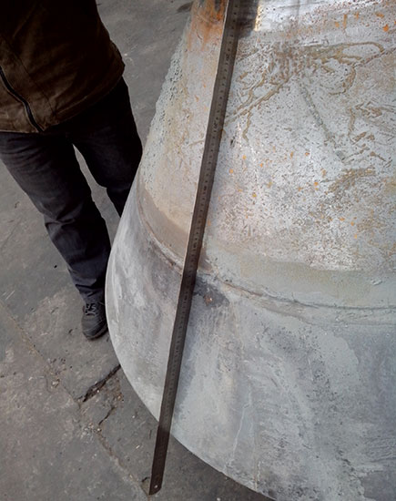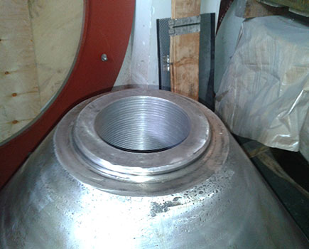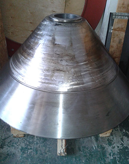 客戶HP500 破碎機動錐體在更換襯板時發現鎖緊螺栓不能拆卸,運到我公司維修。由我司技術人員判定為動錐體內螺紋損壞,同時檢查動錐體外錐面,發現磨損嚴重。